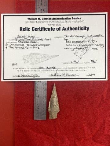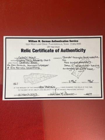 Please see picture for measurment. It is from Central Texas. Comes with William German Certificate of Authenticity. Ex-Don Screws ; Wallace Culpepper ; Jim Ferrell ; Ken Partain ; KEY WORDS: NATIVE AMERICAN INDIAN ARTIFACT ARTIFACTS ARROWHEAD ARROWHEADS MISSISSIPPIAN QUAPAW CADDO POTTERY COINS