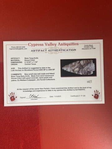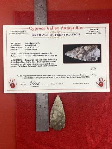 Please see picture for measurment. It is from Central Texas. Comes with Carlos Black Certificate of Authenticity. Ex- Wallace Culpepper ; Jim Ferrell ; Ken Partain ; KEY WORDS: NATIVE AMERICAN INDIAN ARTIFACT ARTIFACTS ARROWHEAD ARROWHEADS MISSISSIPPIAN QUAPAW CADDO POTTERY COINS