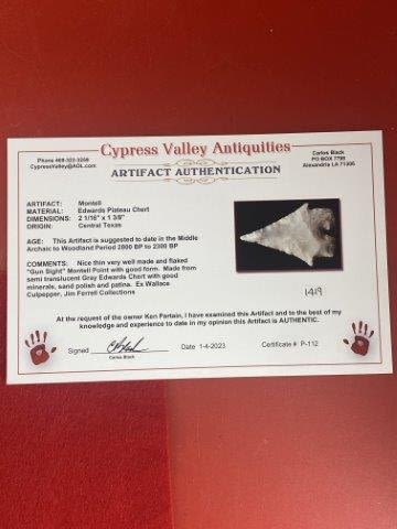 Please see picture for measurment. It is from Central Texas. Comes with Carlos Black Certificate of Authenticity. Ex- Wallace Culpepper ; Jim Ferrell ; Ken Partain ; KEY WORDS: NATIVE AMERICAN INDIAN ARTIFACT ARTIFACTS ARROWHEAD ARROWHEADS MISSISSIPPIAN QUAPAW CADDO POTTERY COINS
