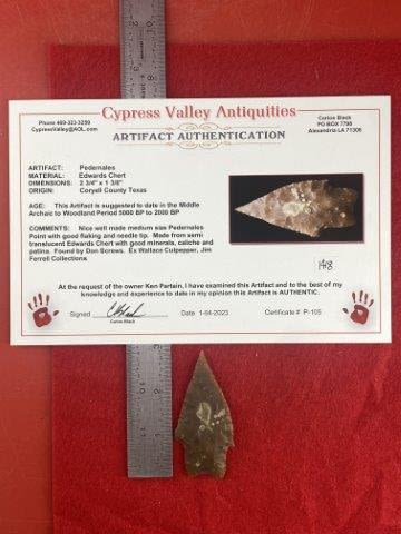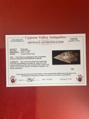 Please see picture for measurment. It is from Coryell County, Texas. Comes with Carlos Black Certificate of Authenticity. Ex- Wallace Culpepper ; Jim Ferrell ; Ken Partain ; KEY WORDS: NATIVE AMERICAN INDIAN ARTIFACT ARTIFACTS ARROWHEAD ARROWHEADS MISSISSIPPIAN QUAPAW CADDO POTTERY COINS