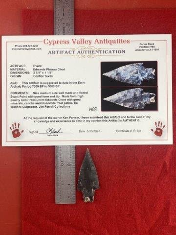 Please see picture for measurment. It is from Central Texas. Comes with Carlos Black Certificate of Authenticity. Ex- Wallace Culpepper ; Jim Ferrell ; Ken Partain ; KEY WORDS: NATIVE AMERICAN INDIAN ARTIFACT ARTIFACTS ARROWHEAD ARROWHEADS MISSISSIPPIAN QUAPAW CADDO POTTERY COINS