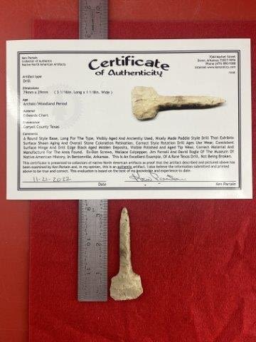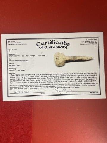 Please see picture for measurment. It is from Coryell County, Texas. Comes with Ken Partain Certificate of Authenticity. Ex-Don Screws ; Wallace Culpepper ; Jim Ferrell ; David Bogle ; Ken Partain ; KEY WORDS: NATIVE AMERICAN INDIAN ARTIFACT ARTIFACTS ARROWHEAD ARROWHEADS MISSISSIPPIAN QUAPAW CADDO POTTERY COINS