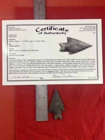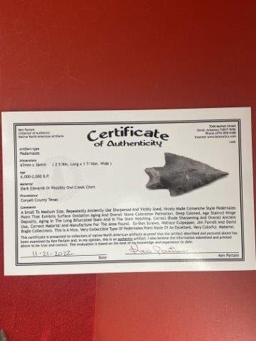 Please see picture for measurment. It is from Coryell County, Texas. Comes with Ken Partain Certificate of Authenticity. Ex- Don Screws ; Wallace Culpepper ; Jim Ferrell ; David Bogle ; Ken Partain ; KEY WORDS: NATIVE AMERICAN INDIAN ARTIFACT ARTIFACTS ARROWHEAD ARROWHEADS MISSISSIPPIAN QUAPAW CADDO POTTERY COINS