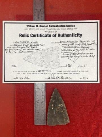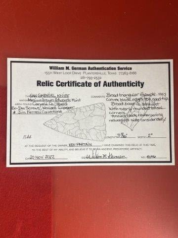 Please see picture for measurment. It is from Coryell County, Texas. Comes with William German Certificate of Authenticity. Ex-Don Screws ; Wallace Culpepper ; Jim Ferrell ; Ken Partain ; KEY WORDS: NATIVE AMERICAN INDIAN ARTIFACT ARTIFACTS ARROWHEAD ARROWHEADS MISSISSIPPIAN QUAPAW CADDO POTTERY COINS