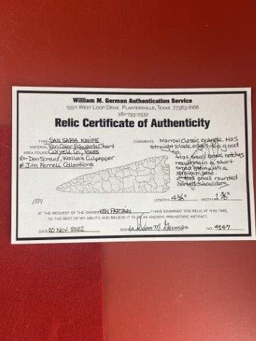 Please see picture for measurment. It is from Coryell County, Texas. Comes with William German Certificate of Authenticity. Ex-Don Screws ; Wallace Culpepper ; Jim Ferrell ; Ken Partain ; KEY WORDS: NATIVE AMERICAN INDIAN ARTIFACT ARTIFACTS ARROWHEAD ARROWHEADS MISSISSIPPIAN QUAPAW CADDO POTTERY COINS