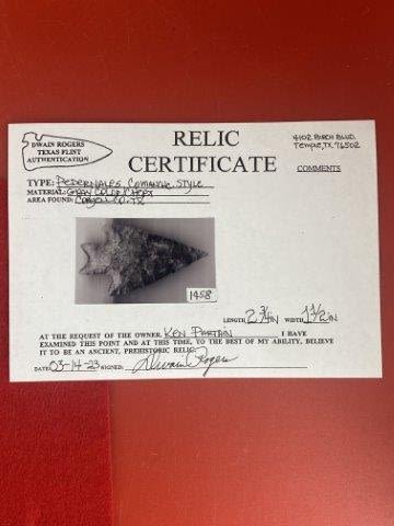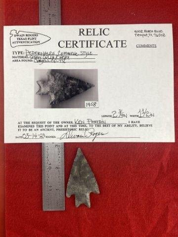 Please see picture for measurment. It is from Coryell County, Texas. Comes with Dwain Roger’s Certificate of Authenticity. Ex-Ken Partain ; KEY WORDS: NATIVE AMERICAN INDIAN ARTIFACT ARTIFACTS ARROWHEAD ARROWHEADS MISSISSIPPIAN QUAPAW CADDO POTTERY COINS