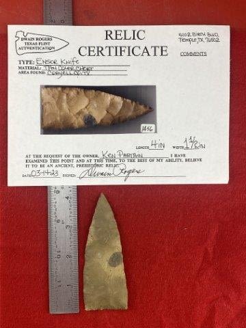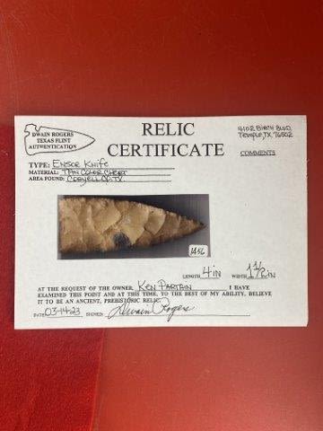 Please see picture for measurment. It is from Coryell County, Texas. Comes with Dwain Roger’s Certificate of Authenticity. Ex-Ken Partain ; KEY WORDS: NATIVE AMERICAN INDIAN ARTIFACT ARTIFACTS ARROWHEAD ARROWHEADS MISSISSIPPIAN QUAPAW CADDO POTTERY COINS