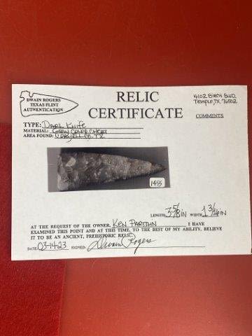 Please see picture for measurment. It is from Coryell County, Texas. Comes with Dwain Roger’s Certificate of Authenticity. Ex-Ken Partain ; KEY WORDS: NATIVE AMERICAN INDIAN ARTIFACT ARTIFACTS ARROWHEAD ARROWHEADS MISSISSIPPIAN QUAPAW CADDO POTTERY COINS
