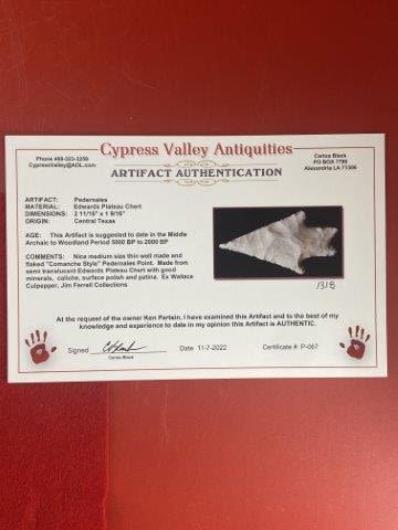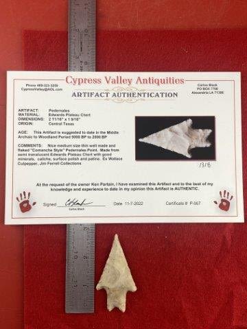 Please see picture for measurment. It is from Central Texas. Comes with Carlos Black Certificate of Authenticity. Ex- Wallace Culpepper ; Jim Ferrell ; Ken Partain ; KEY WORDS: NATIVE AMERICAN INDIAN ARTIFACT ARTIFACTS ARROWHEAD ARROWHEADS MISSISSIPPIAN QUAPAW CADDO POTTERY COINS