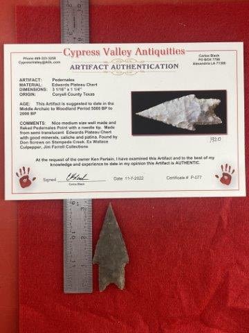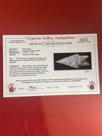 Please see picture for measurment. Found by Don Screws on Stampede Creek in Coryell County, Texas. Comes with Carlos Black Certificate of Authenticity. Ex-Don Screws ; Wallace Culpepper ; Jim Ferrell ; Ken Partain ; KEY WORDS: NATIVE AMERICAN INDIAN ARTIFACT ARTIFACTS ARROWHEAD ARROWHEADS MISSISSIPPIAN QUAPAW CADDO POTTERY COINS