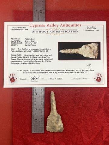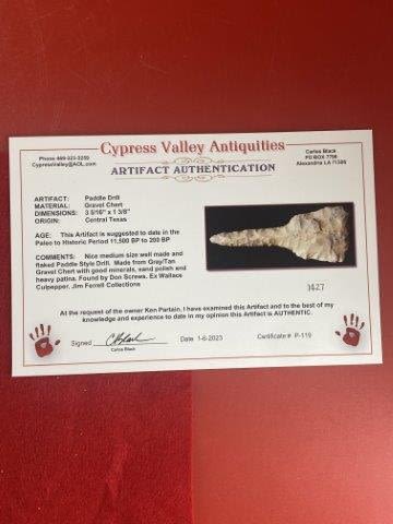 Please see picture for measurment. It is from Central Texas. Comes with Carlos Black Certificate of Authenticity. Ex-Don Screws ; Wallace Culpepper ; Jim Ferrell ; Ken Partain ; KEY WORDS: NATIVE AMERICAN INDIAN ARTIFACT ARTIFACTS ARROWHEAD ARROWHEADS MISSISSIPPIAN QUAPAW CADDO POTTERY COINS