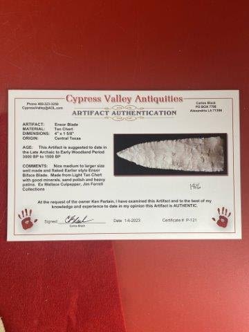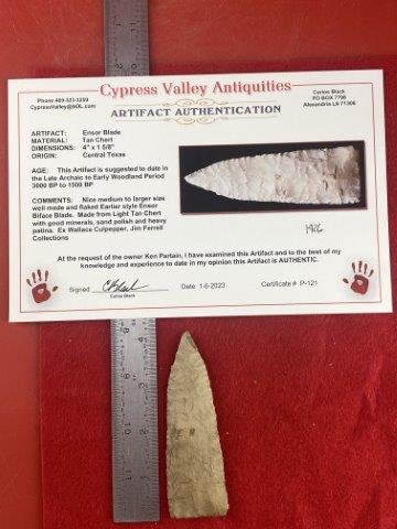 Please see picture for measurment. It is from Central Texas. Comes with Carlos Black Certificate of Authenticity. Ex- Wallace Culpepper ; Jim Ferrell ; Ken Partain ; KEY WORDS: NATIVE AMERICAN INDIAN ARTIFACT ARTIFACTS ARROWHEAD ARROWHEADS MISSISSIPPIAN QUAPAW CADDO POTTERY COINS