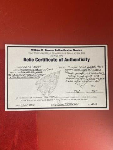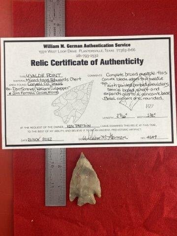 Please see picture for measurment. It is from Coryell County, Texas. Comes with William German Certificate of Authenticity. Ex-Don Screws ; Wallace Culpepper ; Jim Ferrell ; Ken Partain ; KEY WORDS: NATIVE AMERICAN INDIAN ARTIFACT ARTIFACTS ARROWHEAD ARROWHEADS MISSISSIPPIAN QUAPAW CADDO POTTERY COINS