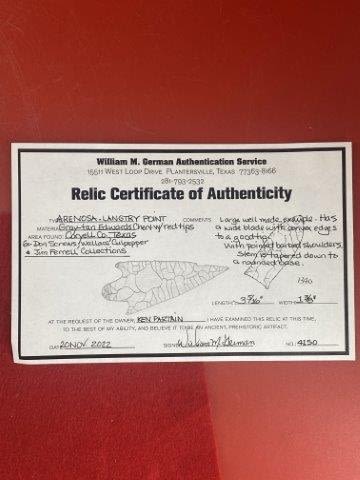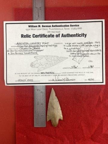 Please see picture for measurment. It is from Coryell County, Texas. Comes with William German Certificate of Authenticity. Ex-Don Screws ; Wallace Culpepper ; Jim Ferrell ; Ken Partain ; KEY WORDS: NATIVE AMERICAN INDIAN ARTIFACT ARTIFACTS ARROWHEAD ARROWHEADS MISSISSIPPIAN QUAPAW CADDO POTTERY COINS