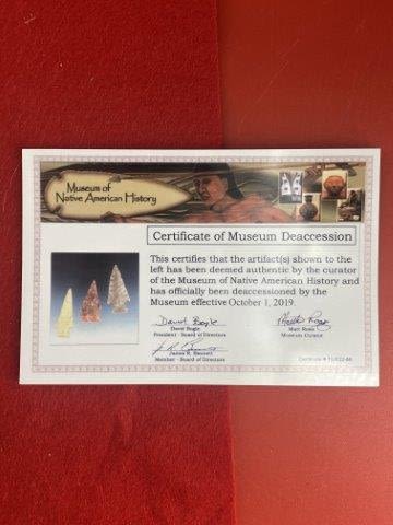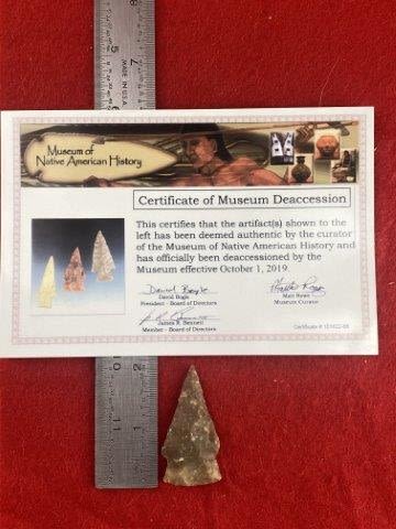 Please see picture for measurment. It is from Texas. Comes with Museum of Native American History Certificate of Authenticity. Ex-Ken Partain ; KEY WORDS: NATIVE AMERICAN INDIAN ARTIFACT ARTIFACTS ARROWHEAD ARROWHEADS MISSISSIPPIAN QUAPAW CADDO POTTERY COINS