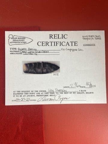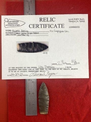 Please see picture for measurment. It is from Central Texas. Comes with Dwain Roger’s Certificate of Authenticity. Ex- Wallace Culpepper ; Ken Partain ; KEY WORDS: NATIVE AMERICAN INDIAN ARTIFACT ARTIFACTS ARROWHEAD ARROWHEADS MISSISSIPPIAN QUAPAW CADDO POTTERY COINS