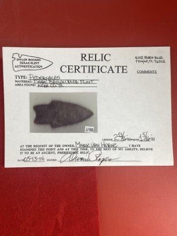 Please see picture for measurment. It is from Kerr County, Texas. Comes with Dwain Roger’s Certificate of Authenticity. Ex-Mark Van Horne ; KEY WORDS: NATIVE AMERICAN INDIAN ARTIFACT ARTIFACTS ARROWHEAD ARROWHEADS MISSISSIPPIAN QUAPAW CADDO POTTERY COINS
