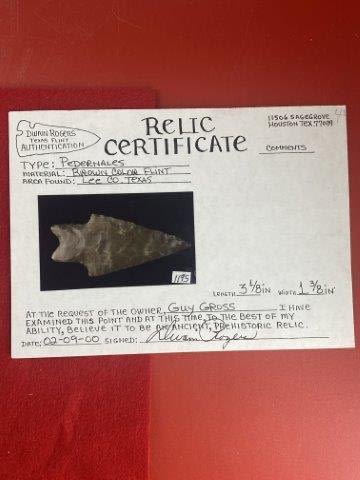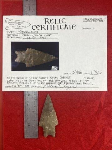 Please see picture for measurment. It is from Lee County, Texas. Comes with Dwain Roger’s Certificate of Authenticity. Ex-Guy Gross ; Ken Partain ; KEY WORDS: NATIVE AMERICAN INDIAN ARTIFACT ARTIFACTS ARROWHEAD ARROWHEADS MISSISSIPPIAN QUAPAW CADDO POTTERY COINS