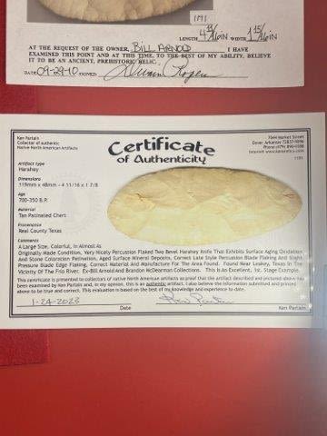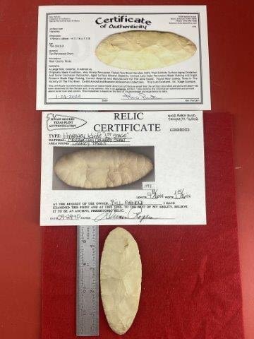 Please see picture for measurment. It is from Leakey, Texas. Comes with Dwain Roger’s and Ken Partain Certificate of Authenticity. Ex-Bill Arnold ; Brandon McDearman; KEY WORDS: NATIVE AMERICAN INDIAN ARTIFACT ARTIFACTS ARROWHEAD ARROWHEADS MISSISSIPPIAN QUAPAW CADDO POTTERY COINS