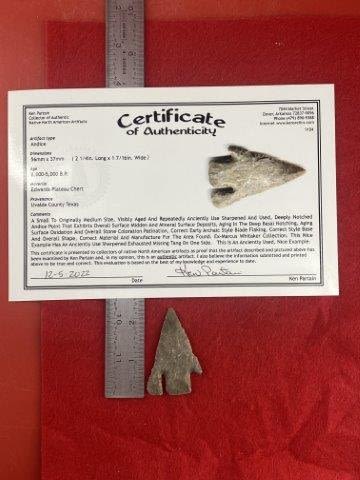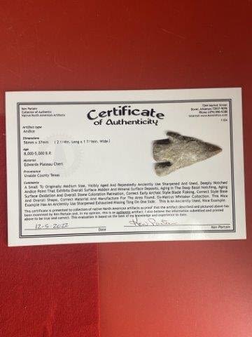 Please see picture for measurment. It is from Uvalde County, Texas. Comes with Ken Partain Certificate of Authenticity. Ex-Marcus Whitaker; Ken Partain ; KEY WORDS: NATIVE AMERICAN INDIAN ARTIFACT ARTIFACTS ARROWHEAD ARROWHEADS MISSISSIPPIAN QUAPAW CADDO POTTERY COINS