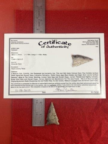 Please see picture for measurment. It is from Travis County, Texas. Comes with Ken Partain Certificate of Authenticity. Ex-Don Screws ; Wallace Culpepper ; Jim Ferrell ; Ken Partain ; KEY WORDS: NATIVE AMERICAN INDIAN ARTIFACT ARTIFACTS ARROWHEAD ARROWHEADS MISSISSIPPIAN QUAPAW CADDO POTTERY COINS
