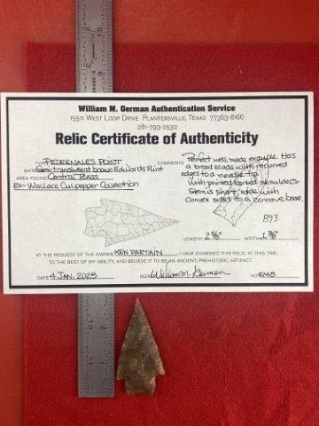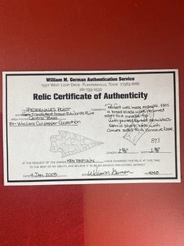 Please see picture for measurment. It is from Central Texas. Comes with William German Certificate of Authenticity. Ex- Wallace Culpepper ; Ken Partain ; KEY WORDS: NATIVE AMERICAN INDIAN ARTIFACT ARTIFACTS ARROWHEAD ARROWHEADS MISSISSIPPIAN QUAPAW CADDO POTTERY COINS