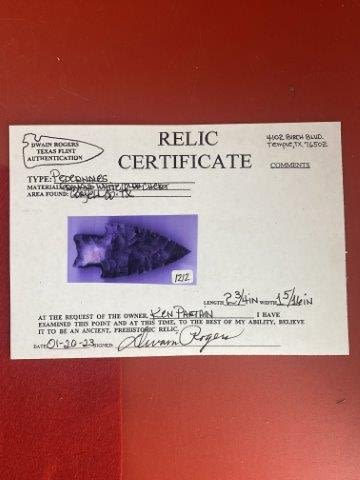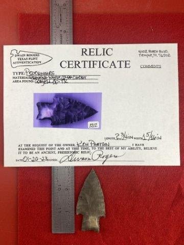 Please see picture for measurment. It is from Coryell County, Texas. Comes with Dwain Roger’s Certificate of Authenticity. Ex-Ken Partain ; KEY WORDS: NATIVE AMERICAN INDIAN ARTIFACT ARTIFACTS ARROWHEAD ARROWHEADS MISSISSIPPIAN QUAPAW CADDO POTTERY COINS