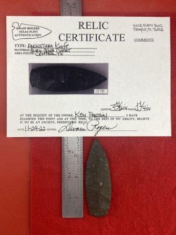 Please see picture for measurment. It is from Central Texas. Comes with Dwain Roger’s Certificate of Authenticity. Ex-Ken Partain ; KEY WORDS: NATIVE AMERICAN INDIAN ARTIFACT ARTIFACTS ARROWHEAD ARROWHEADS MISSISSIPPIAN QUAPAW CADDO POTTERY COINS
