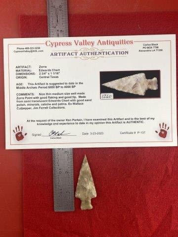 Please see picture for measurment. It is from Central Texas. Comes with Carlos Black Certificate of Authenticity. Ex- Wallace Culpepper ; Jim Ferrell ; Ken Partain ; KEY WORDS: NATIVE AMERICAN INDIAN ARTIFACT ARTIFACTS ARROWHEAD ARROWHEADS MISSISSIPPIAN QUAPAW CADDO POTTERY COINS