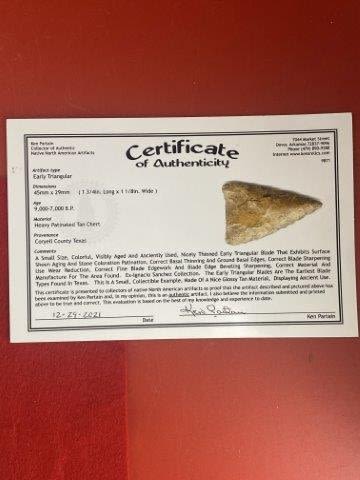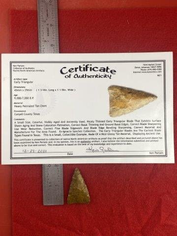 Please see picture for measurment. It is from Coryell County, Texas. Comes with Ken Partain Certificate of Authenticity. Ex- Ignacio Sanchez ; KEY WORDS: NATIVE AMERICAN INDIAN ARTIFACT ARTIFACTS ARROWHEAD ARROWHEADS MISSISSIPPIAN QUAPAW CADDO POTTERY COINS