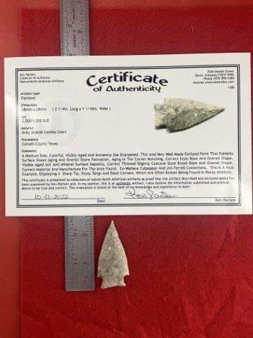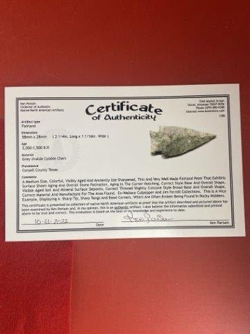 Please see picture for measurment. It is from Coryell County, Texas. Comes with Ken Partain Certificate of Authenticity. Ex- Wallace Culpepper ; Jim Ferrell ; Ken Partain ; KEY WORDS: NATIVE AMERICAN INDIAN ARTIFACT ARTIFACTS ARROWHEAD ARROWHEADS MISSISSIPPIAN QUAPAW CADDO POTTERY COINS