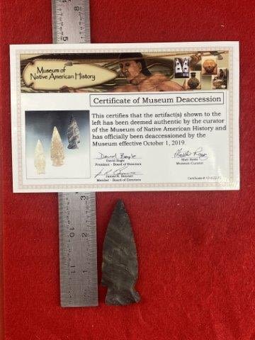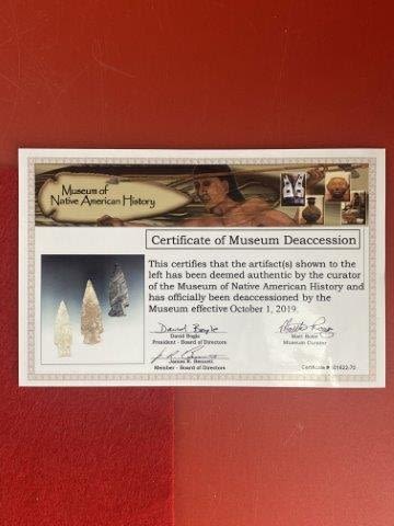 Please see picture for measurment. It is from Texas. Comes with Museum of Native American History Certificate of Authenticity. Ex-Ken Partain ; KEY WORDS: NATIVE AMERICAN INDIAN ARTIFACT ARTIFACTS ARROWHEAD ARROWHEADS MISSISSIPPIAN QUAPAW CADDO POTTERY COINS