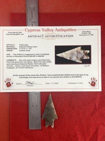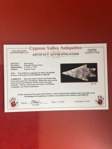 Please see picture for measurment. It is from Central Texas. Comes with Carlos Black Certificate of Authenticity. Ex- Wallace Culpepper ; Jim Ferrell ; Ken Partain ; KEY WORDS: NATIVE AMERICAN INDIAN ARTIFACT ARTIFACTS ARROWHEAD ARROWHEADS MISSISSIPPIAN QUAPAW CADDO POTTERY COINS