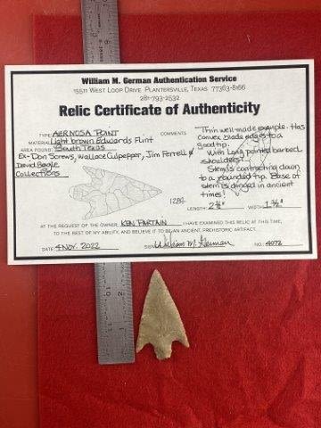 Please see picture for measurment. It is from South Texas. Comes with William German Certificate of Authenticity. Ex-Don Screws ; Wallace Culpepper ; Jim Ferrell ; David Bogle ; Ken Partain ; KEY WORDS: NATIVE AMERICAN INDIAN ARTIFACT ARTIFACTS ARROWHEAD ARROWHEADS MISSISSIPPIAN QUAPAW CADDO POTTERY COINS