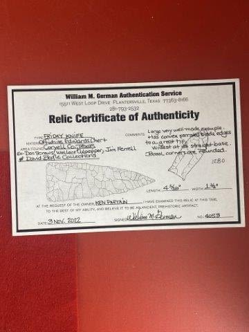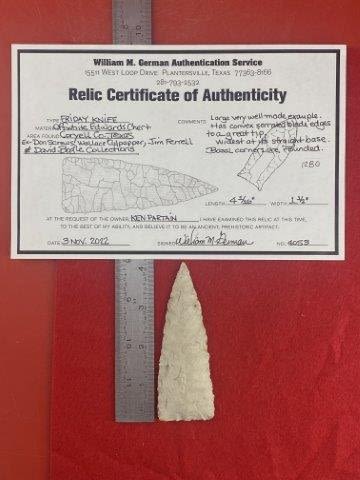 Please see picture for measurment. It is from Coryell County, Texas. Comes with William German Certificate of Authenticity. Ex-Don Screws ; Wallace Culpepper ; Jim Ferrell ; David Bogle ; Ken Partain ; KEY WORDS: NATIVE AMERICAN INDIAN ARTIFACT ARTIFACTS ARROWHEAD ARROWHEADS MISSISSIPPIAN QUAPAW CADDO POTTERY COINS
