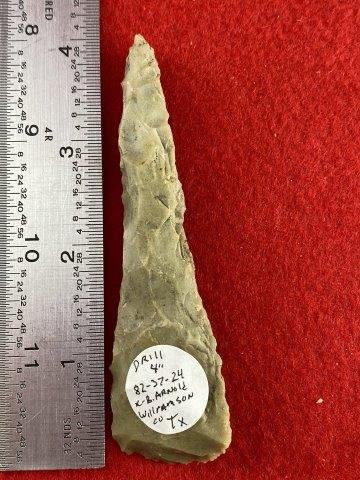 Please see picture for measurement. It is from Williamson County Texas. All artifacts came from the great state of Texas. Ex-Bill Arnold, Warren & Darla Suleske Collection, they are pictured in Who Who’s #12. They have collected wonderful arrowheads & artifacts for over 40 years! KEY WORDS: NATIVE AMERICAN INDIAN ARTIFACT ARTIFACTS ARROWHEAD ARROWHEADS MISSISSIPPIAN QUAPAW CADDO POTTERY COINS