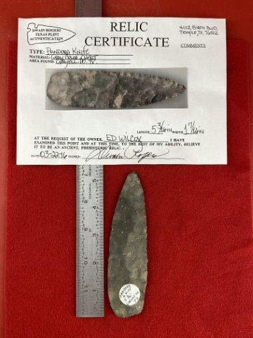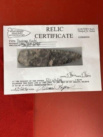 Please see picture for measurement. It is from Coryell County Texas. It comes with a Dwain Rogers Certificate of Authenticity. All artifacts came from the great state of Texas. Ex-Ed Wilcox, Warren & Darla Suleske Collection, they are pictured in Who Who’s #12. They have collected wonderful arrowheads & artifacts for over 40 years! KEY WORDS: NATIVE AMERICAN INDIAN ARTIFACT ARTIFACTS ARROWHEAD ARROWHEADS MISSISSIPPIAN QUAPAW CADDO POTTERY COINS