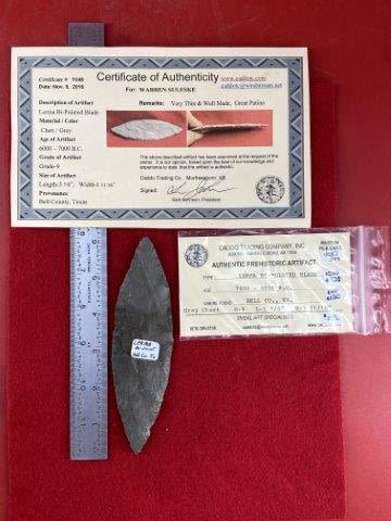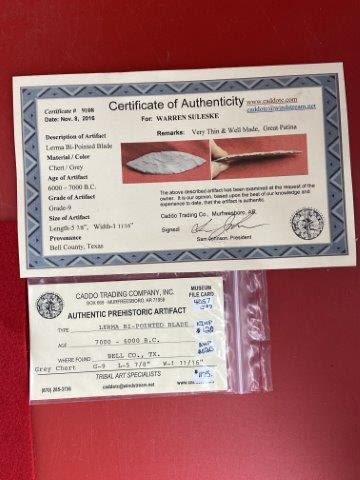 Please see picture for measurement. It is from Bell County Texas. It comes with a Sam Johnson Certificate of Authenticity. All artifacts came from the great state of Texas. Ex-Warren & Darla Suleske Collection, they are pictured in Who Who’s #12. They have collected wonderful arrowheads & artifacts for over 40 years! KEY WORDS: NATIVE AMERICAN INDIAN ARTIFACT ARTIFACTS ARROWHEAD ARROWHEADS MISSISSIPPIAN QUAPAW CADDO POTTERY COINS