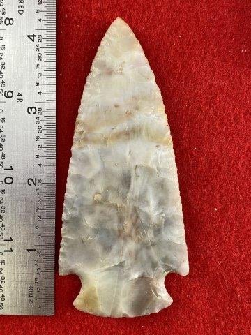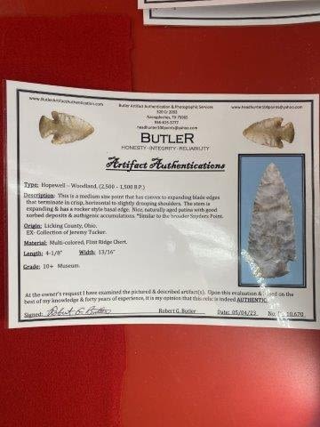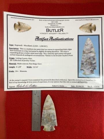 Please see picture for measurment. It is from Licking County Ohio. Ex- Jeremy Tucker collection. It comes with a Butler Certificate Of Authenticity. These artifacts are from multiple collections from around the United States. KEY WORDS: NATIVE AMERICAN INDIAN ARTIFACT ARTIFACTS ARROWHEAD ARROWHEADS MISSISSIPPIAN QUAPAW CADDO POTTERY COINS