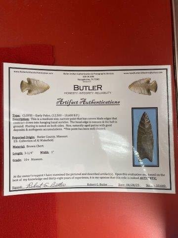 Please see picture for measurment. It is from Butler County Missouri. Ex-Al Wakefield collection. It comes with a Butler Certificate Of Authenticity. These artifacts are from multiple collections from around the United States. KEY WORDS: NATIVE AMERICAN INDIAN ARTIFACT ARTIFACTS ARROWHEAD ARROWHEADS MISSISSIPPIAN QUAPAW CADDO POTTERY COINS