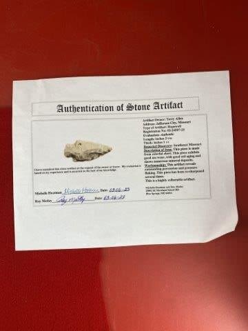 Please see picture for measurement. It is from Southeast Missouri. It comes with a Roy Motley Certificate of Authenticity. These artifacts are from multiple collections from around the United States. KEY WORDS: NATIVE AMERICAN INDIAN ARTIFACT ARTIFACTS ARROWHEAD ARROWHEADS MISSISSIPPIAN QUAPAW CADDO POTTERY COINS MORGAN DOLLAR PEACE DOLLAR SILVER COINS