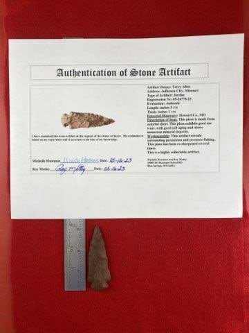 Please see picture for measurement. It is from Howard County Missouri. It comes with a Roy Motley Certificate of Authenticity.These artifacts are from multiple collections from around the United States. KEY WORDS: NATIVE AMERICAN INDIAN ARTIFACT ARTIFACTS ARROWHEAD ARROWHEADS MISSISSIPPIAN QUAPAW CADDO POTTERY COINS MORGAN DOLLAR PEACE DOLLAR SILVER COINS