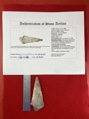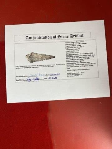 Please see picture for measurement.It is from St. Charles County Missouri. It comes with a Roy Motley Certificate of Authenticity. These artifacts are from multiple collections from around the United States. KEY WORDS: NATIVE AMERICAN INDIAN ARTIFACT ARTIFACTS ARROWHEAD ARROWHEADS MISSISSIPPIAN QUAPAW CADDO POTTERY COINS MORGAN DOLLAR PEACE DOLLAR SILVER COINS