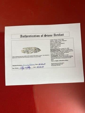 Please see picture for measurement. It is from Cooper County Missouri. It comes with a Roy Motley Certificate of Authenticity. These artifacts are from multiple collections from around the United States. KEY WORDS: NATIVE AMERICAN INDIAN ARTIFACT ARTIFACTS ARROWHEAD ARROWHEADS MISSISSIPPIAN QUAPAW CADDO POTTERY COINS MORGAN DOLLAR PEACE DOLLAR SILVER COINS