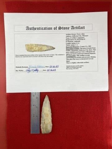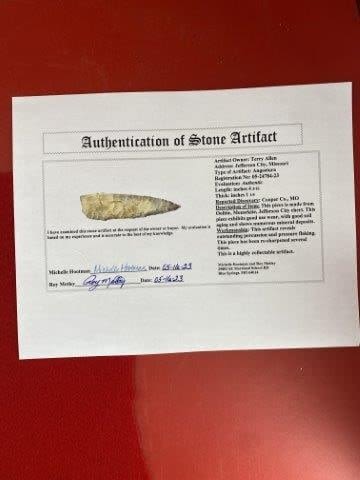 Please see picture for measurement. It is from Cooper County Missouri. It comes with a Roy Motley Certificate of Authenticity. These artifacts are from multiple collections from around the United States. KEY WORDS: NATIVE AMERICAN INDIAN ARTIFACT ARTIFACTS ARROWHEAD ARROWHEADS MISSISSIPPIAN QUAPAW CADDO POTTERY COINS MORGAN DOLLAR PEACE DOLLAR SILVER COINS