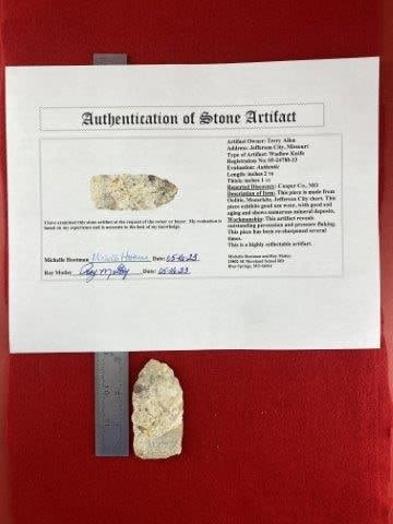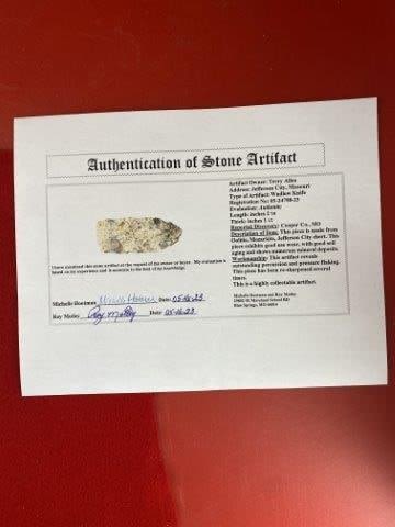Please see picture for measurement. It is from Cooper County Missouri. It comes with a Roy Motley Certificate of Authenticity. These artifacts are from multiple collections from around the United States. KEY WORDS: NATIVE AMERICAN INDIAN ARTIFACT ARTIFACTS ARROWHEAD ARROWHEADS MISSISSIPPIAN QUAPAW CADDO POTTERY COINS MORGAN DOLLAR PEACE DOLLAR SILVER COINS
