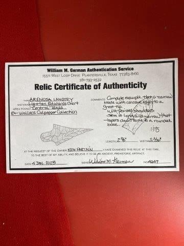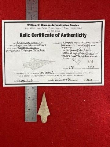 Please see picture for measurment. It is from Central Texas. Comes with William German Certificate of Authenticity. Ex- Ken Partain ; KEY WORDS: NATIVE AMERICAN INDIAN ARTIFACT ARTIFACTS ARROWHEAD ARROWHEADS MISSISSIPPIAN QUAPAW CADDO POTTERY COINS
