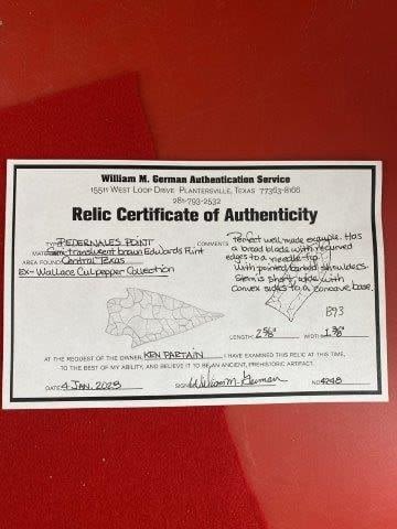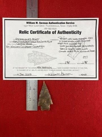 Please see picture for measurment. It is from Central Texas. Comes with William German Certificate of Authenticity. Ex- Wallace Culpepper ; Ken Partain ; KEY WORDS: NATIVE AMERICAN INDIAN ARTIFACT ARTIFACTS ARROWHEAD ARROWHEADS MISSISSIPPIAN QUAPAW CADDO POTTERY COINS