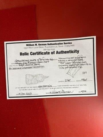 Please see picture for measurment. It is from East Central Texas. Comes with William German Certificate of Authenticity. Ex- Wallace Culpepper ; Ken Partain ; KEY WORDS: NATIVE AMERICAN INDIAN ARTIFACT ARTIFACTS ARROWHEAD ARROWHEADS MISSISSIPPIAN QUAPAW CADDO POTTERY COINS