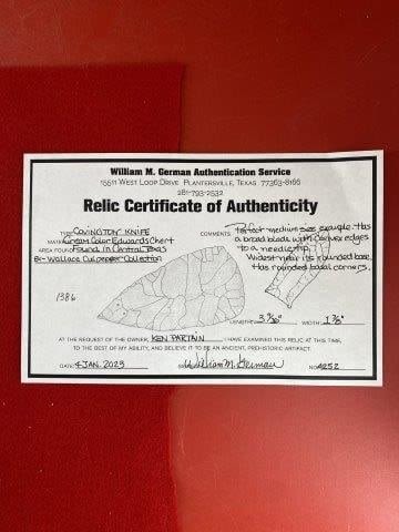 Please see picture for measurment. It is from Central Texas. Comes with William German Certificate of Authenticity. Ex- Wallace Culpepper ; Ken Partain ; KEY WORDS: NATIVE AMERICAN INDIAN ARTIFACT ARTIFACTS ARROWHEAD ARROWHEADS MISSISSIPPIAN QUAPAW CADDO POTTERY COINS